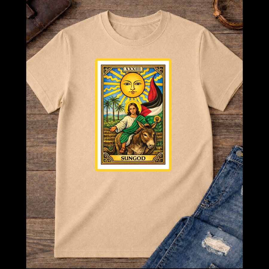 CLICK FOR MOREThe Sun Card with baby Jesus on a donkey w/ Palestinian Flag T-shirt - SunGod - Palms Available in Different Color and Sizes